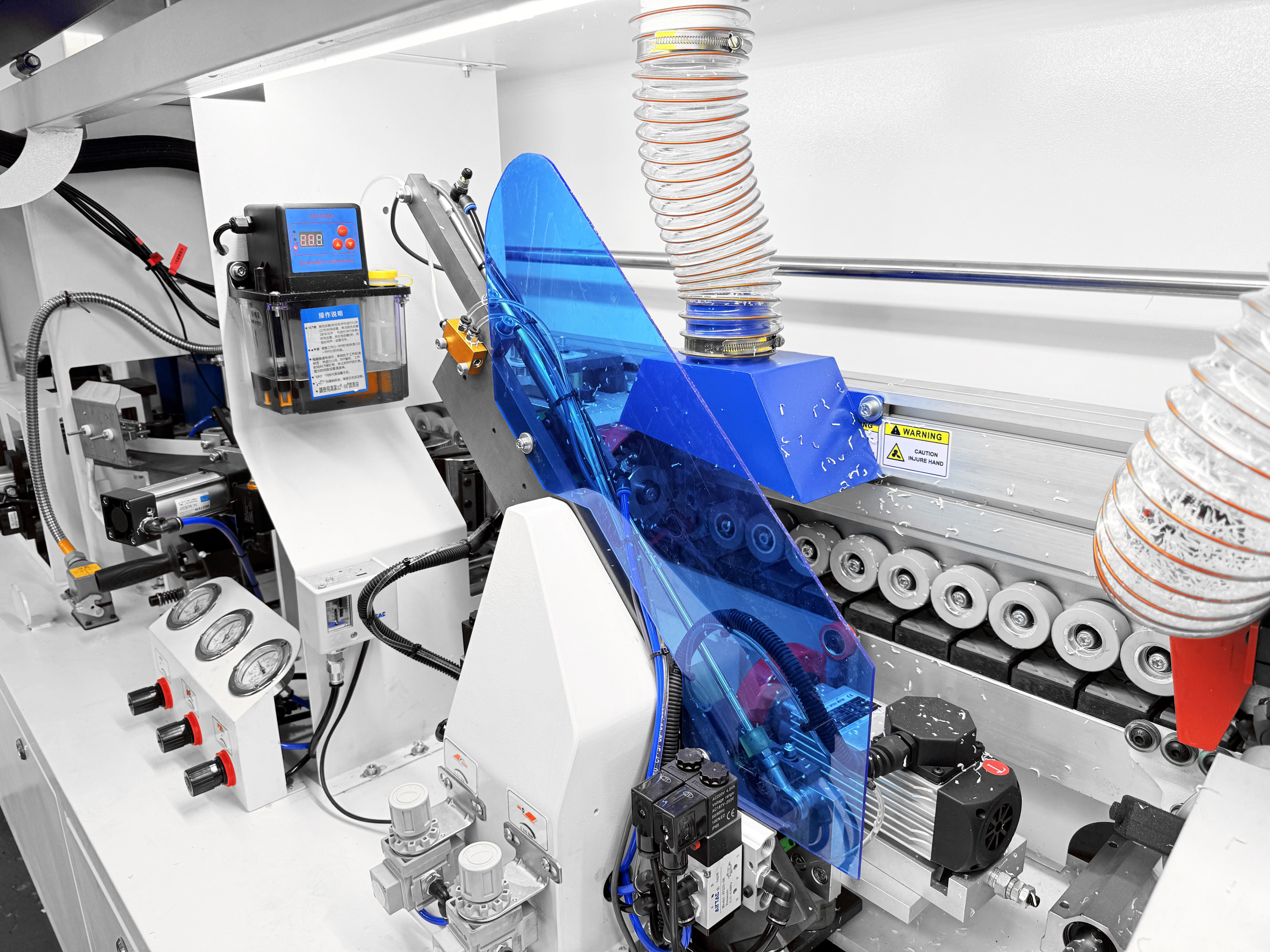Прижимной блок с пневматическим управлением оснащен одним основным и двумя допрессовочными роликами со скребками, давление на ролики может регулироваться в зависимости от типа используемой кромки и деталей. Каждый ролик оснащен индивидуальным пневмоцилиндром.