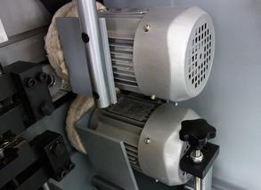 Узел оснащен электропневматическим управлением в горизонтальной плоскости, двумя моторами 2 x 1,25 кВт, 12 000 об/мин (первый мотор работает в направлении подачи, второй против - для избежание сколов), максимальный припуск на обработку 3 мм.