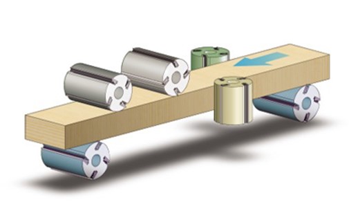 Механизм подачи состоит из верхних и нижних стальных роликов. Рифленые ролики на входе и обрезиненные на выходе, приводятся в движение системой карданных приводов и редукторов. Рифленые ролики обеспечивают стабильную подачу, а обрезиненные ролики на выходе не оставят никаких следов даже на самых мягких породах древесины.