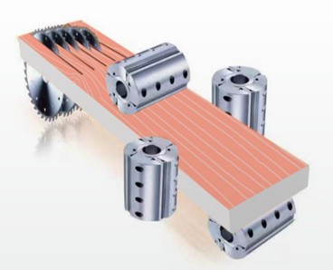 Механизм подачи состоит из верхних и нижних стальных роликов. Рифленые ролики на входе и обрезиненные на выходе, приводятся в движение системой карданных приводов и редукторов. Рифленые ролики обеспечивают стабильную подачу, а обрезиненные ролики на выходе не оставят никаких следов даже на самых мягких породах древесины.
