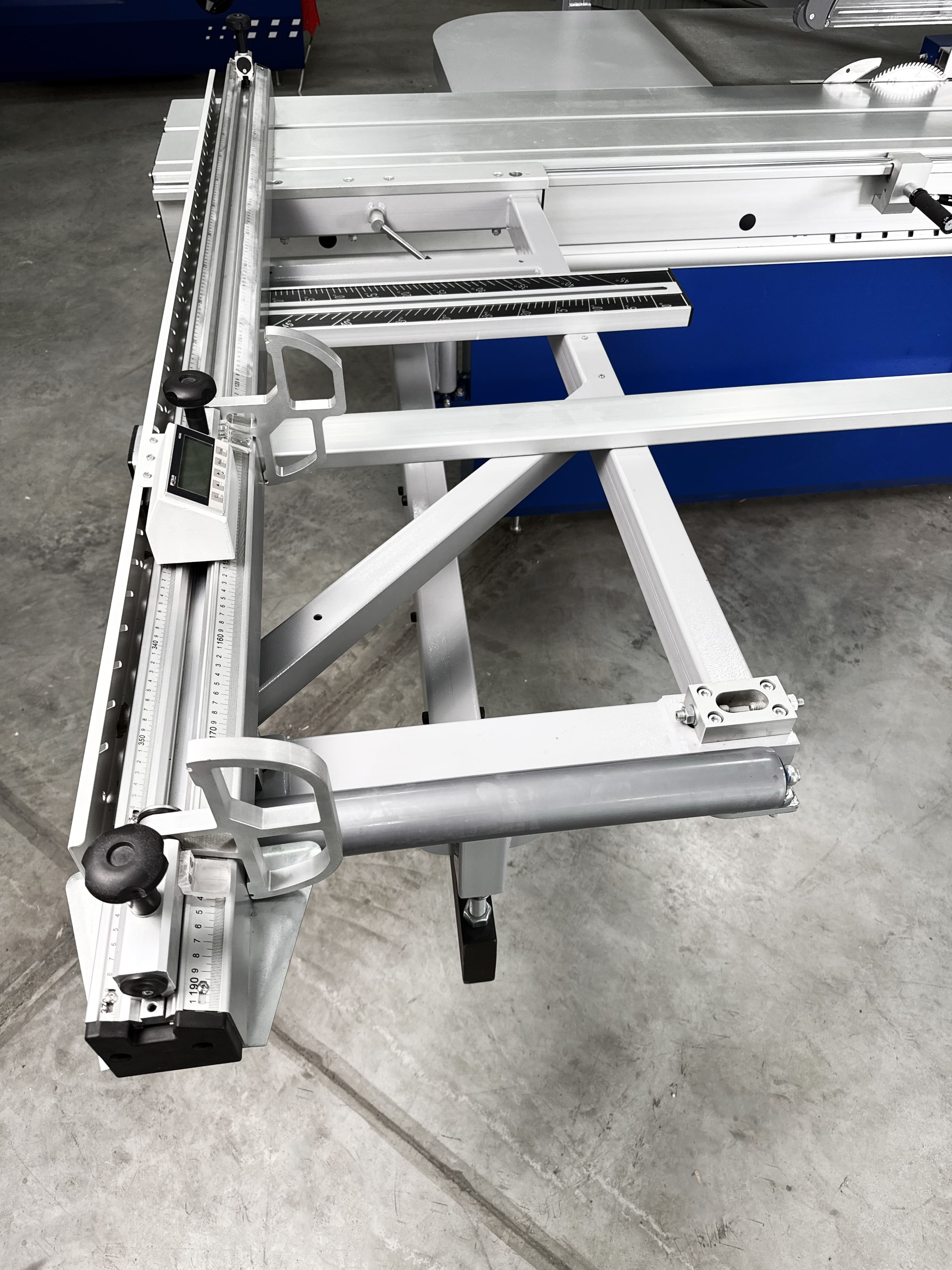 Опорный стол можно передвигать и быстро фиксировать с помощью мощного зажима. Система настройки и регулировки диагоналей, выполненная с 2-х сторон стола, позволяет применять схему раскроя на мелкие детали «от себя», так, как это выполнено на станках ведущих европейских производителей.