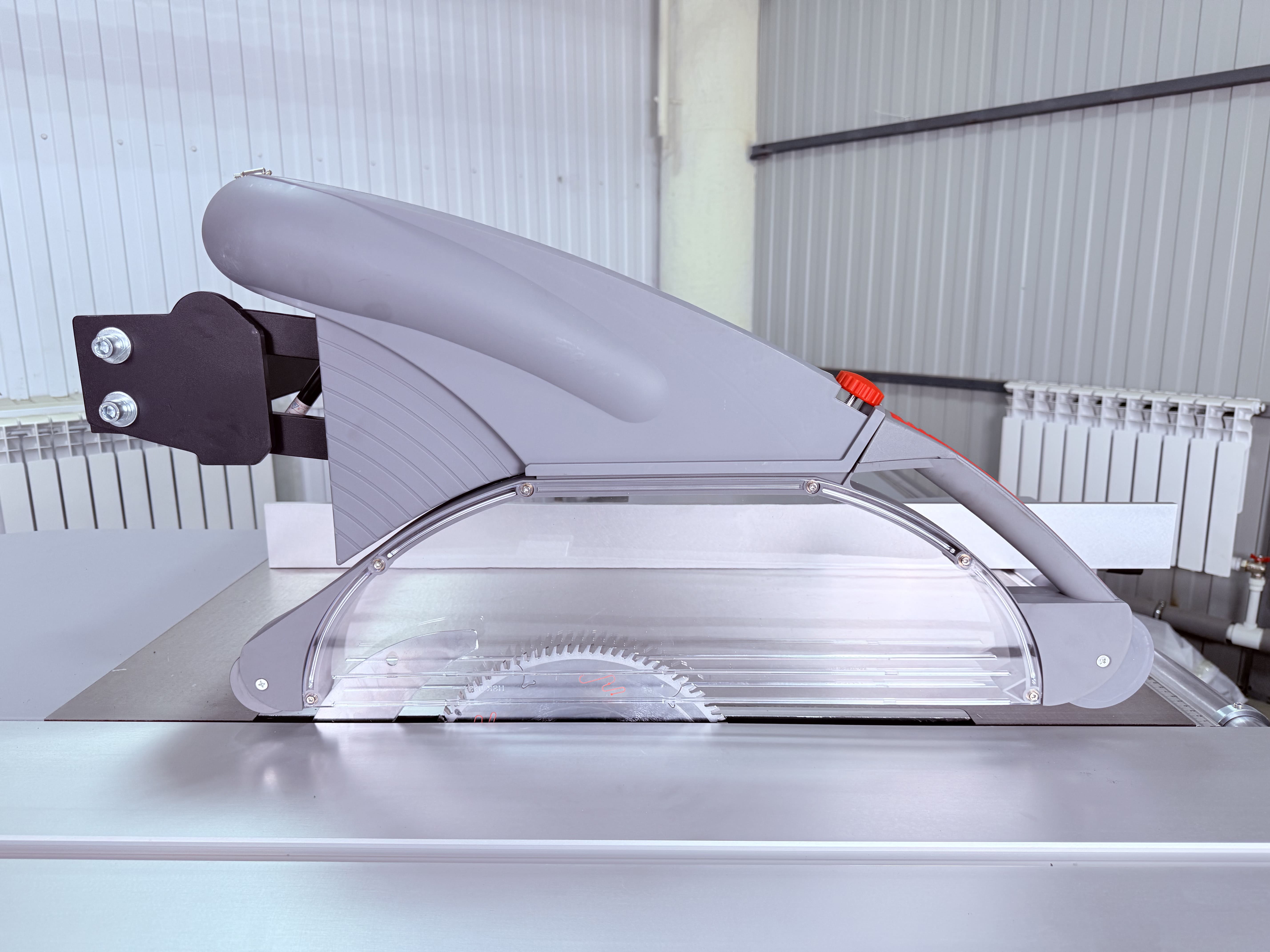 Защитный кожух пилы с роликами качения по заготовке легко регулируется по высоте, обеспечивая качественное пылеудаление, а также защиту оператора. Такая конструкция позволяет исключить из раскроя расклинивающий нож без снятия защитного кожуха. Большой европейский пылесборник, безопасный и не создающий пыли в рабочем состоянии, оснащен петлями и быстрозажимным механизмом. Если он не используется, его можно сложить или легко заблокировать. Любое положение быстрой остановки, верхний европейский пылесборник, стандартный фитинг, 2 крышки под углом 45 и 90 градусов.