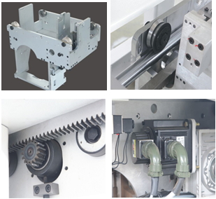 Узел перемещается по двум стальным круглым направляющим с помощью серводвигателя и передачи шестерня - рейка. Такая схема гарантирует максимальную скорость холостого хода, плавность подачи каретки при рабочем ходе и стабильность качества раскроя.