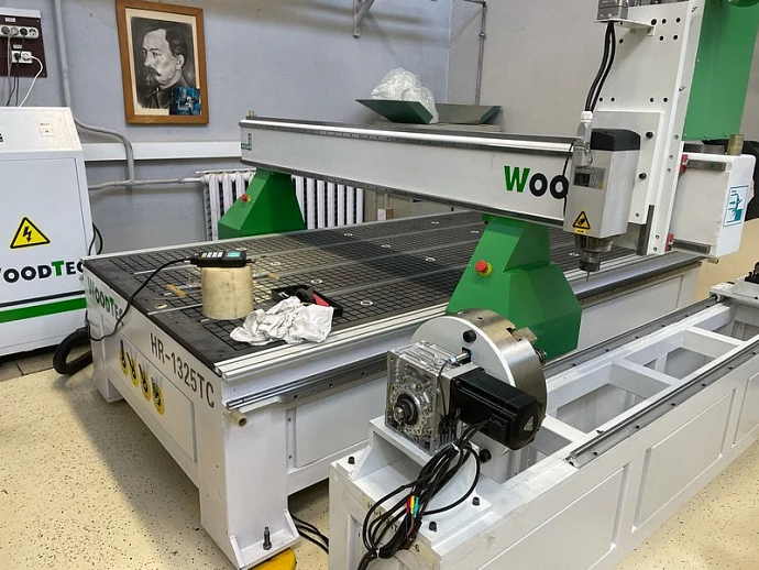 Ось вращения для обработки балясин. Максимальный диаметр заготовки - 300 мм. Длина заготовки максимальная - 1500 мм. Поставляется с трехкулачковым патроном и задней бабкой, перемещающейся по направляющим. Поддерживается полноценная четырехосевая обработка.