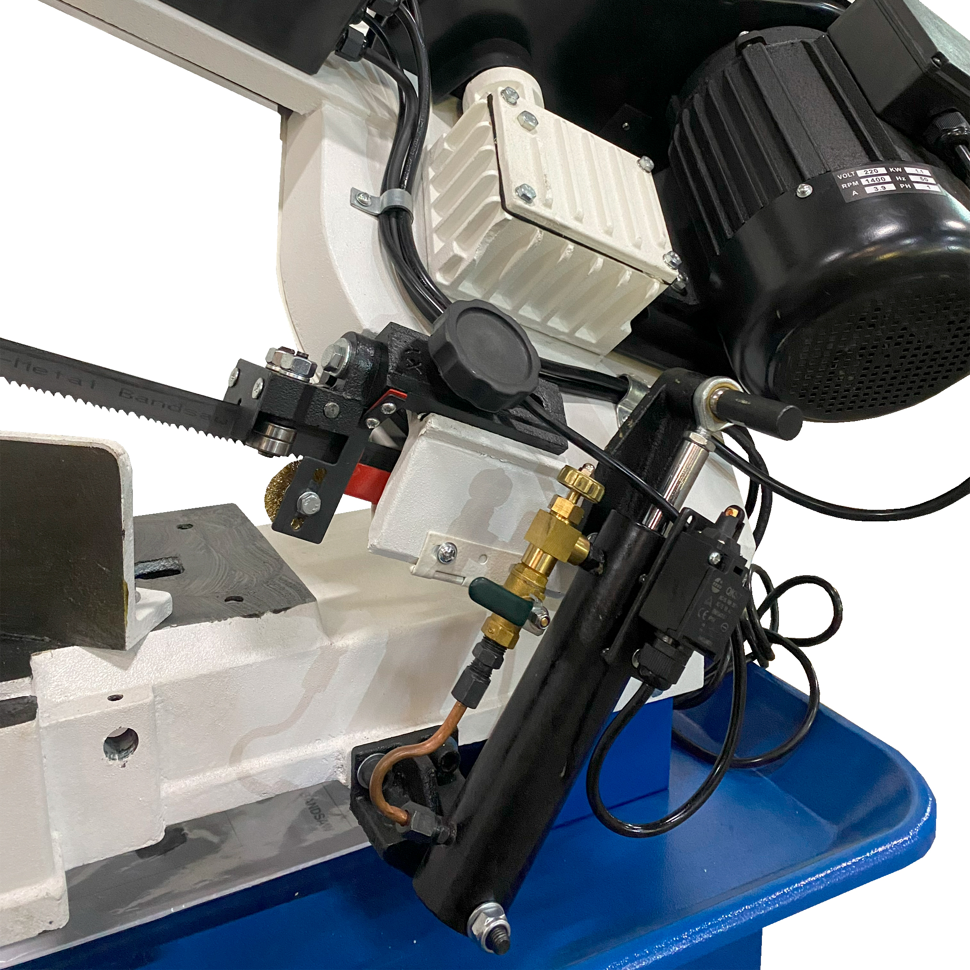 Позиционирование полотна под 90° относительно тисков обеспечивают подшипники, установленные на креплении режущего инструмента. Вылет крепления можно изменять в зависимости от размера обрабатываемой заготовки.
