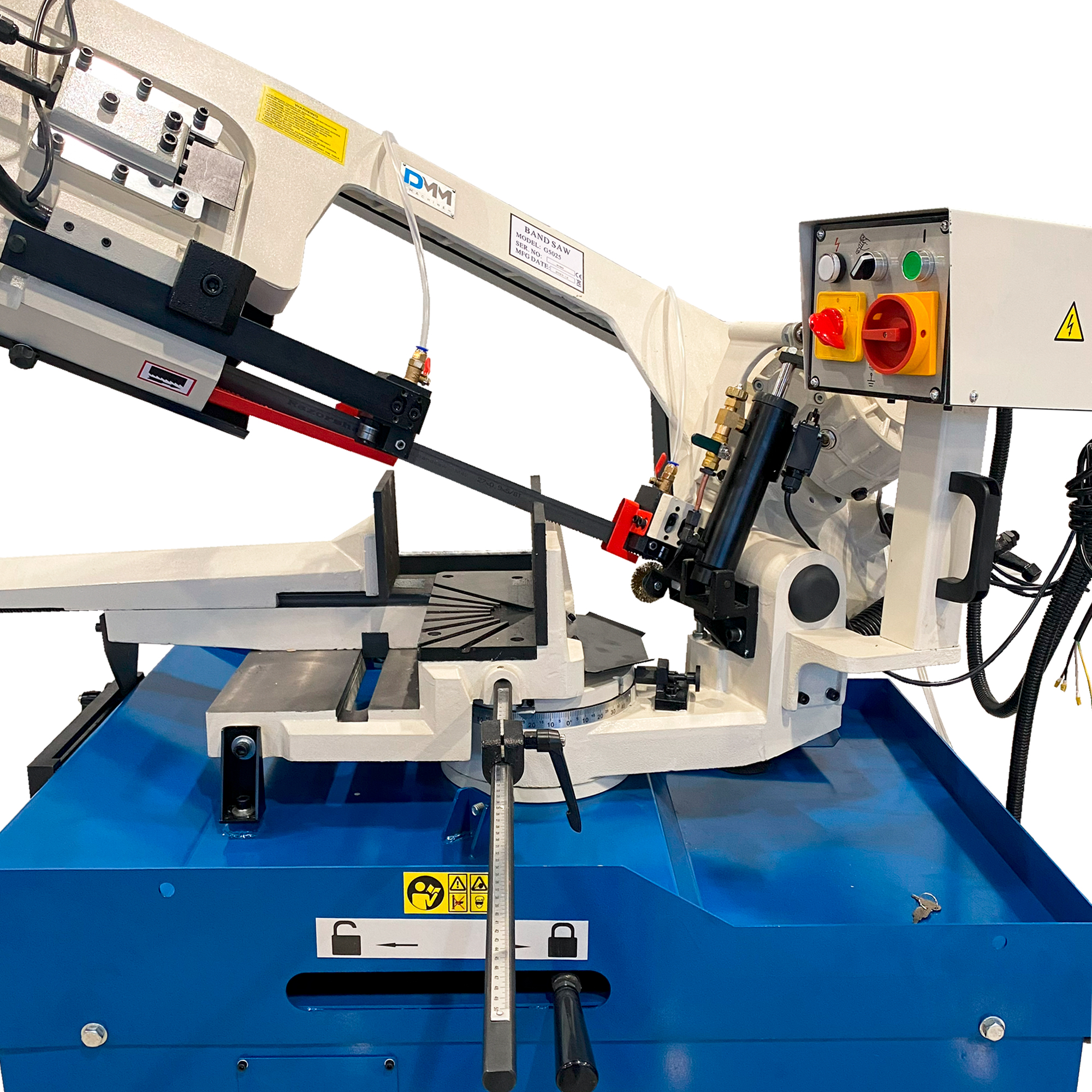 У ленточнопильного станка DMM MWS-250 органы управления вынесены на отдельную панель, а также есть возможность переключения запуска станка с ручки, находится рукоятка на противоположной стороне станка, на самом маятнике.