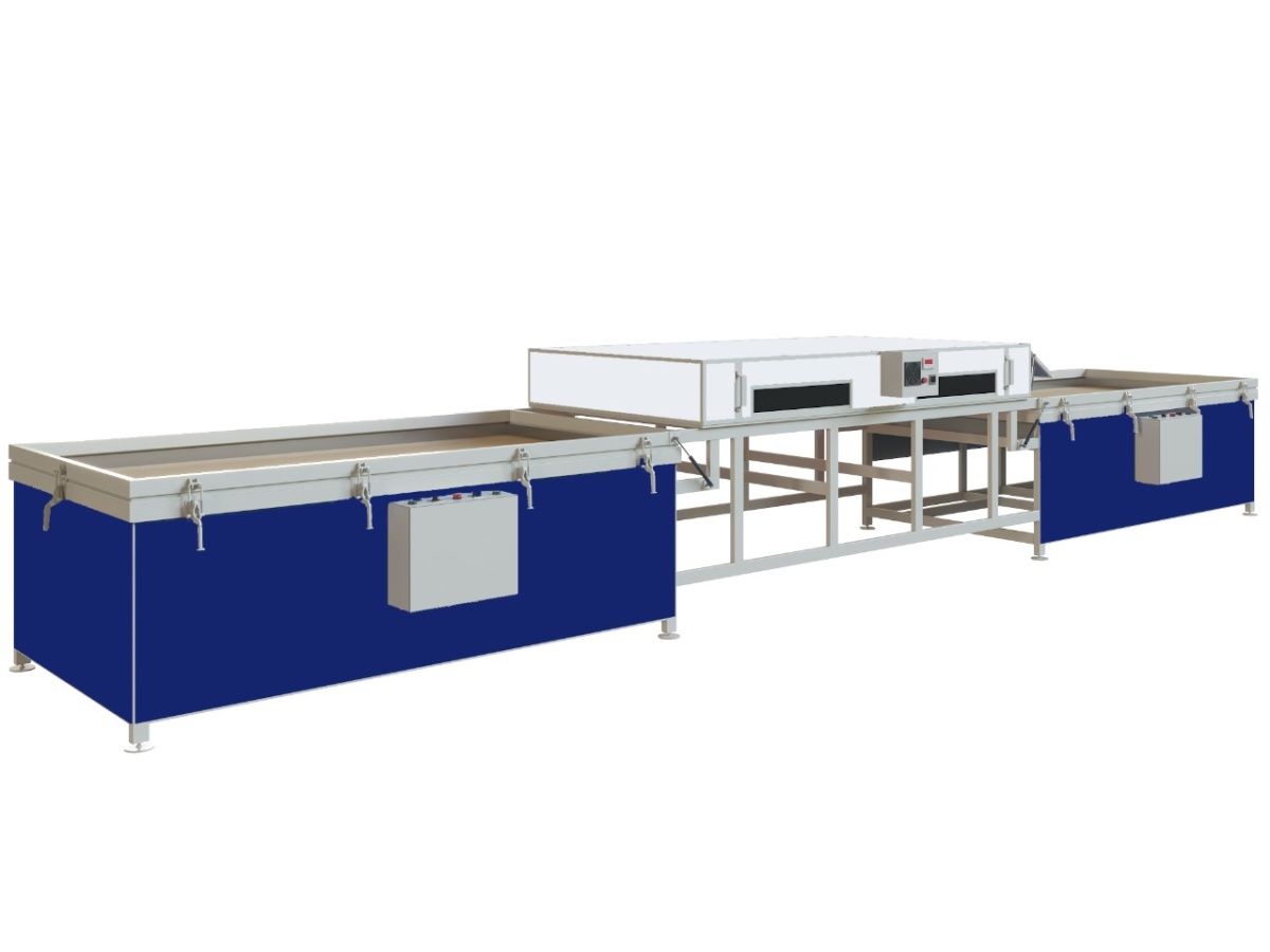 Откатной термомодуль оборудован специальными роликами и перемещается между двумя рабочими столами через "зону покоя" легко и без усилий. В конце пути с обеих сторон имеются ограничители хода с отбойниками. В термомодуле имеются откидные боковые створки. Перемещение термомодуля происходит легко, оператору не потребуется прилагать усилий для данной процедуры. Доступ к рабочему столу в данной модификации имеется со всех 4-х сторон, в отличии от вакуумного пресса с откидным термомодулем.