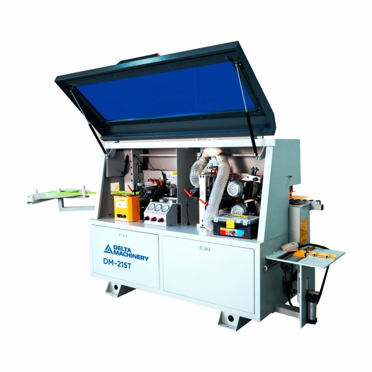 Состоит из основного и двух допрессовочных роликов с пневматическим управлением для надежного приклеивания кромочного материала на торец детали.