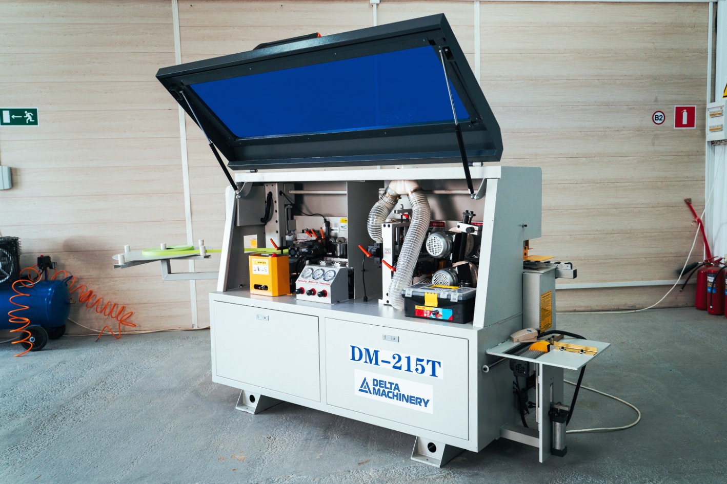Пневматический торцовочный агрегат с высокооборотистым мотором компактно расположен в торцевой части станка.