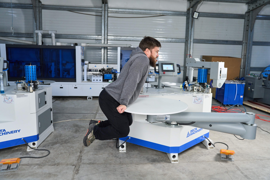 Главная особенность данного станка – это подвижная вакуумная консоль, которая позволяет без труда в одиночку приклеивать кромочный материал на крупногабаритные криволинейные и прямолинейные детали и два узла: узел для приклеивания кромки + фрезерный узел для снятия свесов, что в совокупности автоматизирует цикл работы с любыми криволинейными деталями.