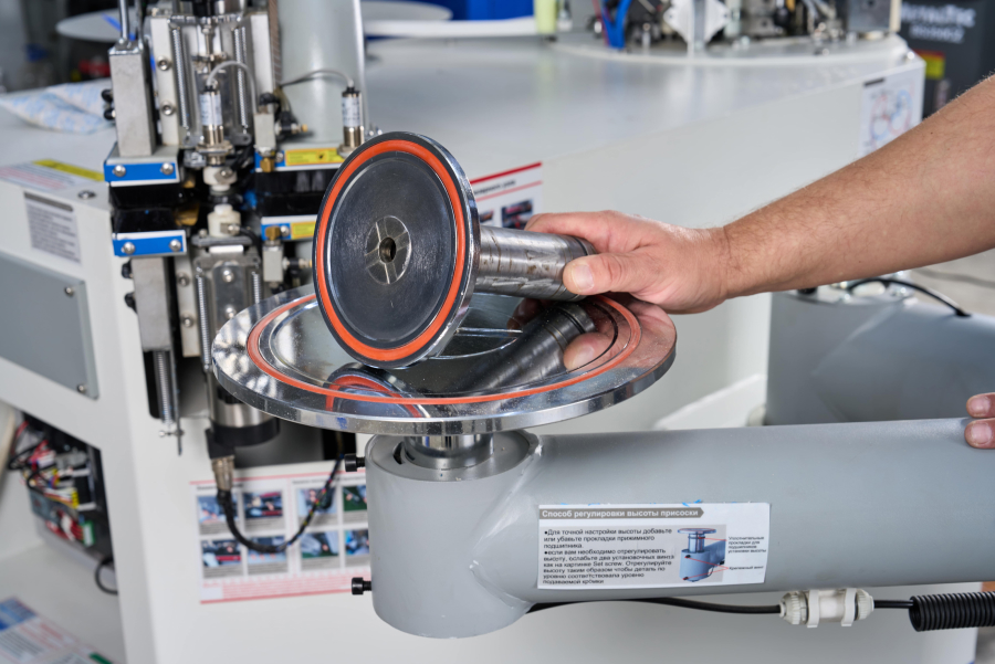 Надежная выдвижная консоль грузоподъемностью 100 кг, для перемещения детали в течении всего цикла обработки, с вакуумной фиксацией укомплектована двумя типами сменных насадок диаметром 300 мм и 140 мм, для удобства работы с различными типоразмерами деталей.