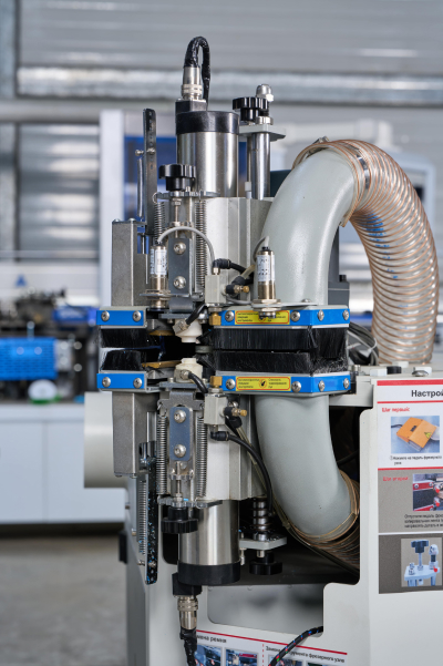 Для получения максимально качественного результата приклеивания кромки станок оборудован форсунками для подачи разделительной жидкости в зону контакта плоскости заготовки и свеса кромки.