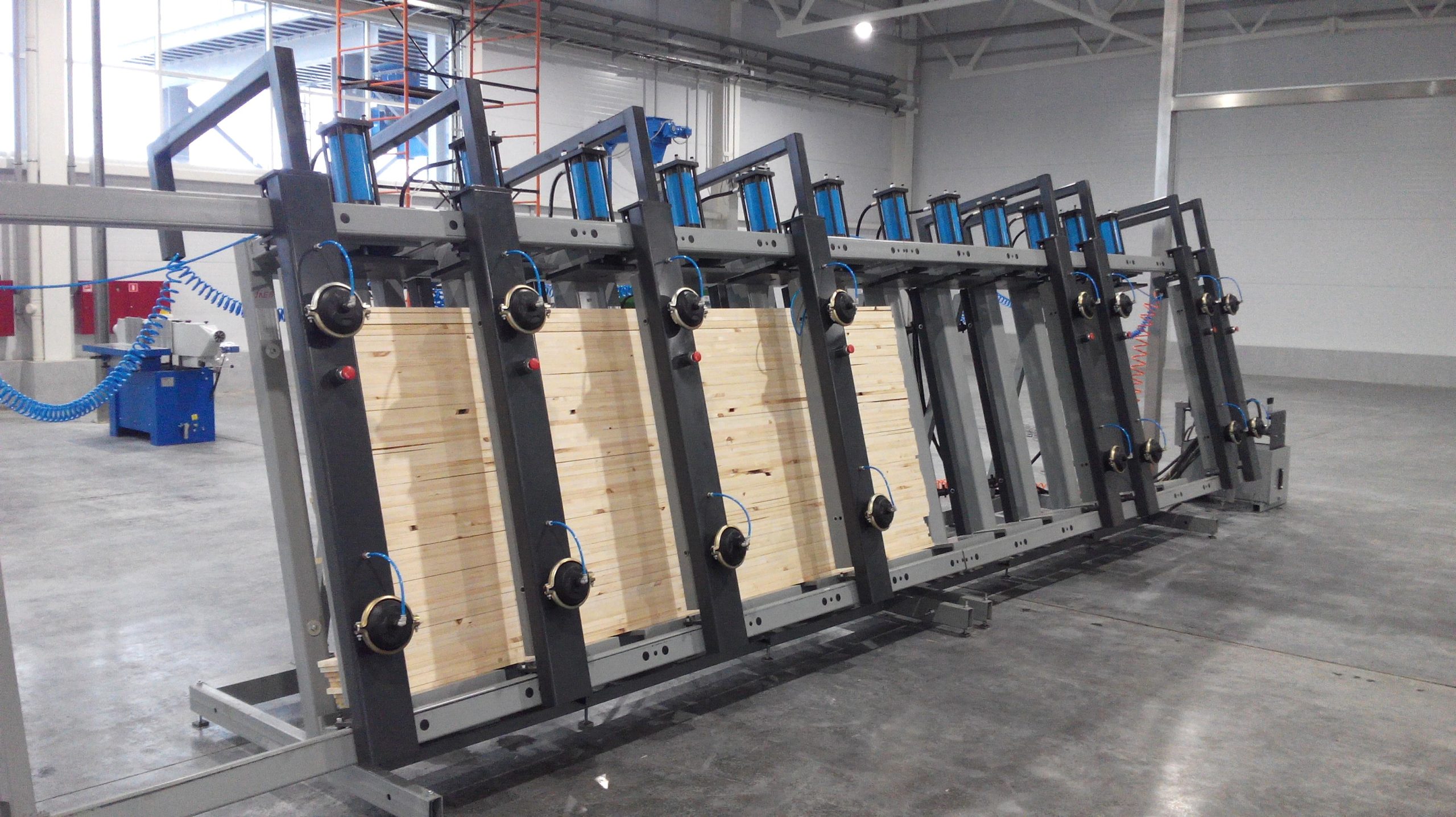 Вайма гидравлическая оснащена откатными пневматическими фронтальными прижимами. Их перемещение за пределы рабочей зоны обеспечивает свободный доступ при укладке и выгрузке. Откатные пневматические фронтальные прижимы гарантированно выравнивают и удерживают пакет заготовок во время прессования.