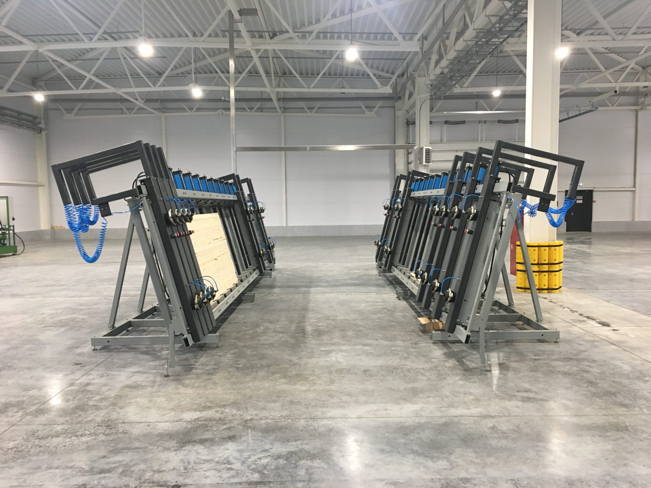 Вайма гидравлическая оснащена откатными пневматическими фронтальными прижимами. Их перемещение за пределы рабочей зоны обеспечивает свободный доступ при укладке и выгрузке. Откатные пневматические фронтальные прижимы гарантированно выравнивают и удерживают пакет заготовок во время прессования.