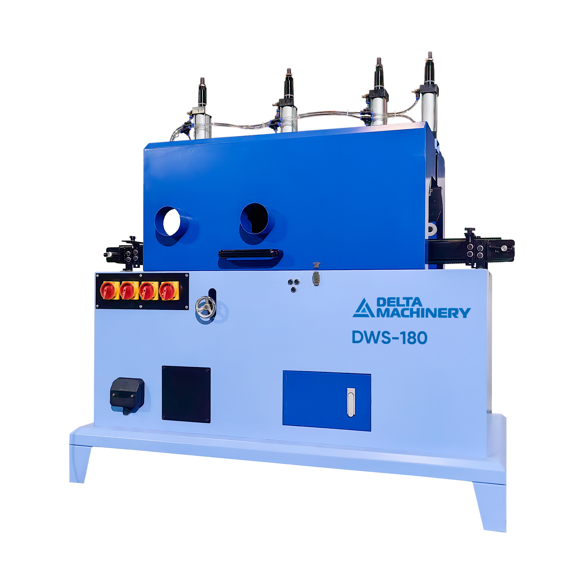 Станок имеет две вертикальные прижимные группы оснащенные пневмоцилиндрами, что позволяет надежно фиксировать заготовку по ходу ее движения и обработки. Усилие прижима задается регулировкой пневматики.