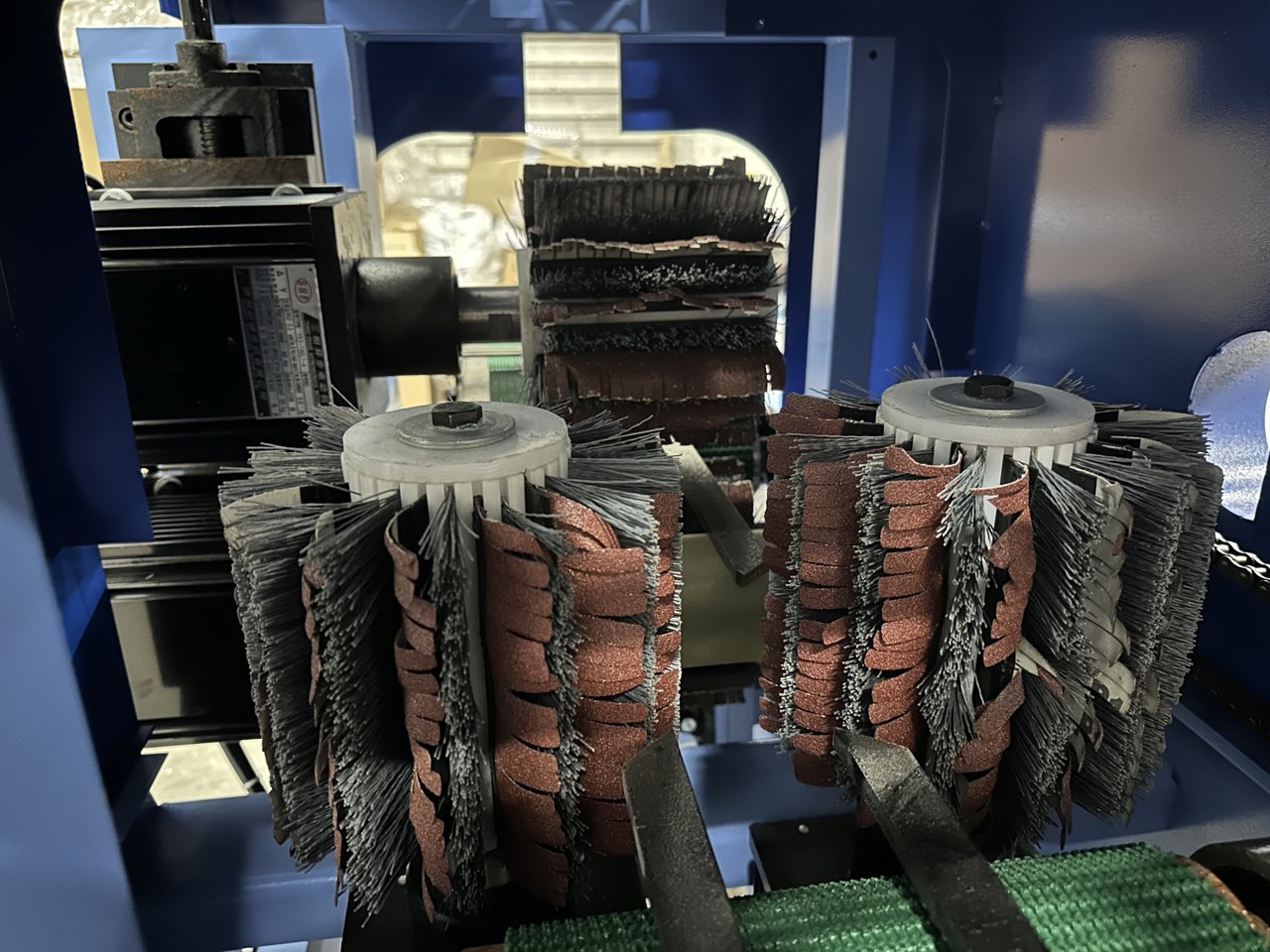 Станок в базовом исполнении оснащен щеточно-шлифовальными барабанами. При необходимости можно укомплектовать ленточно-шлифовальными барабанами (как на фото). Вне зависимости от вида шлифовальных барабанов они будут иметь функцию осцилляции, для более качественной обработки и экономии расходных шлифовальных элементов.