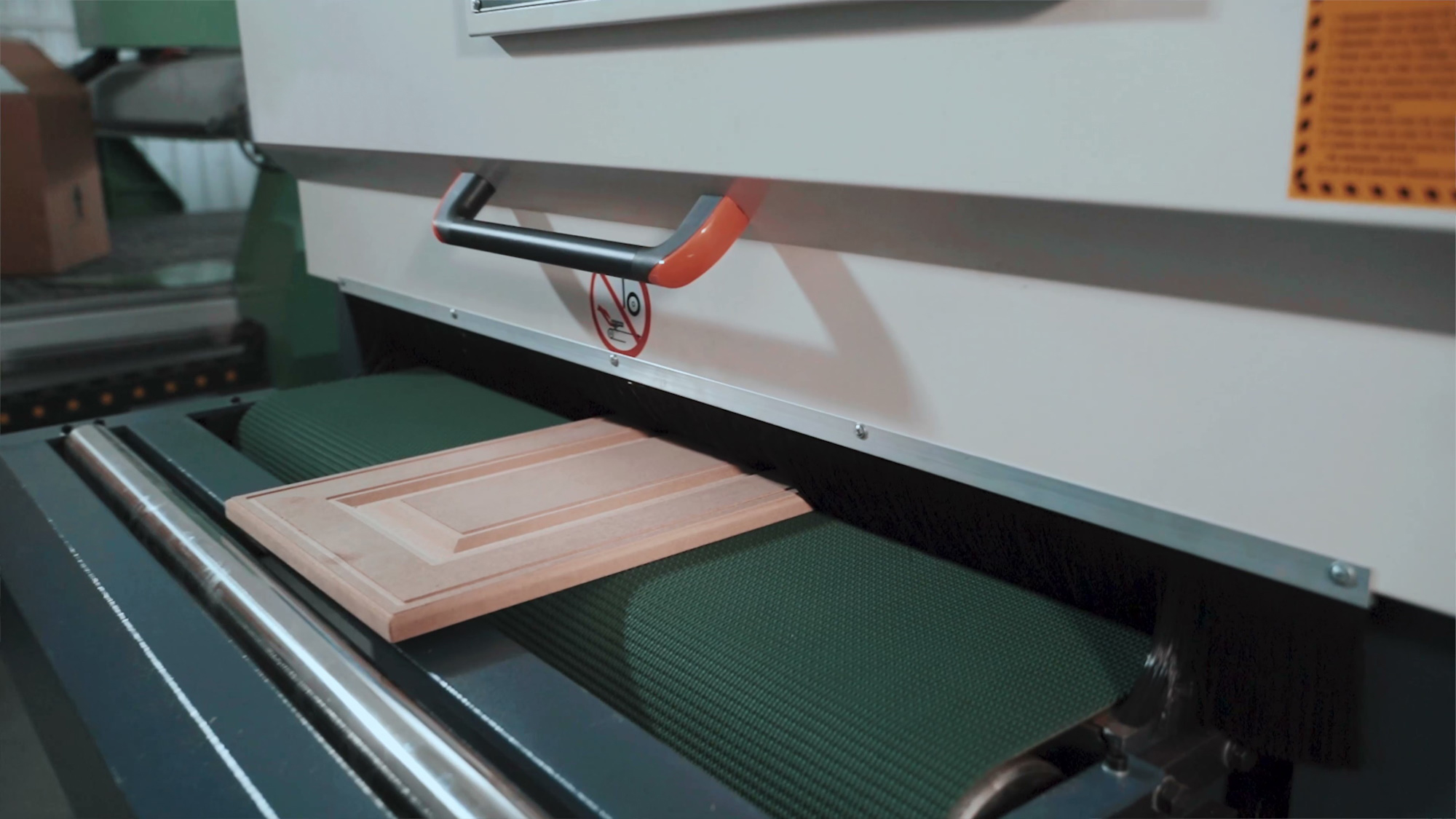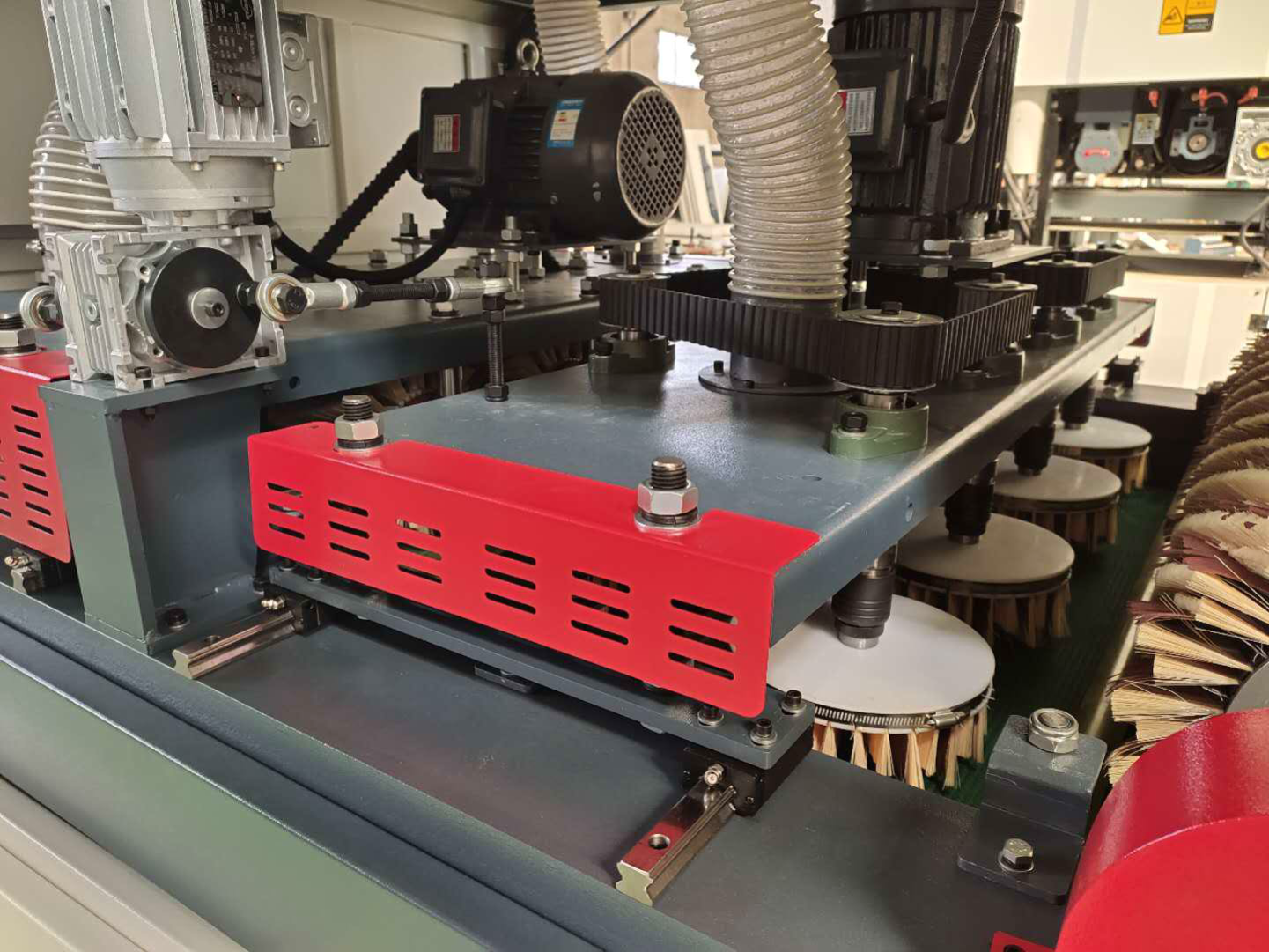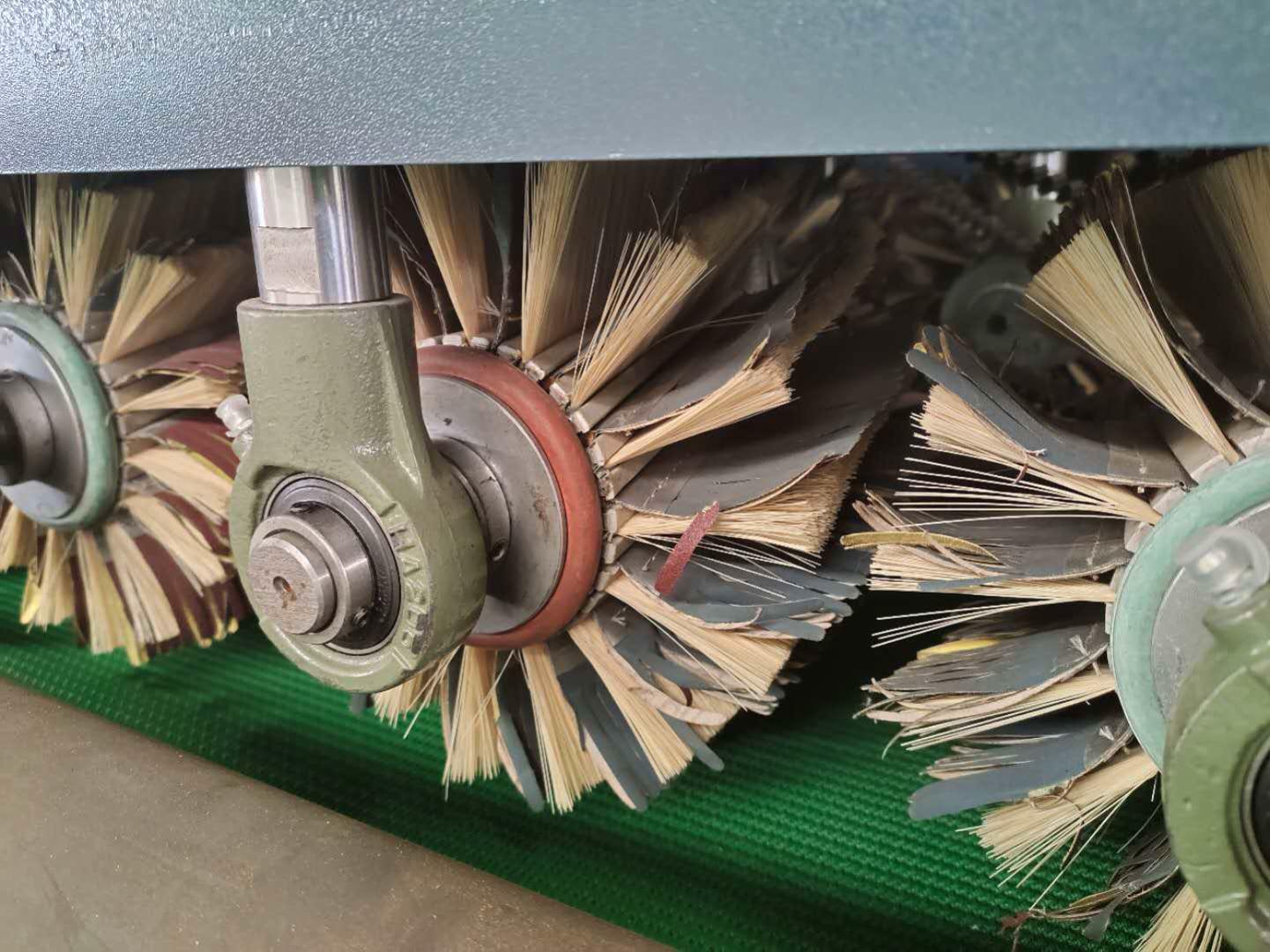 Финишным этапом обработки является продольный шлифовальный блок (два барабана во всю ширину рабочего стола, с щетками расположенными по спирали)