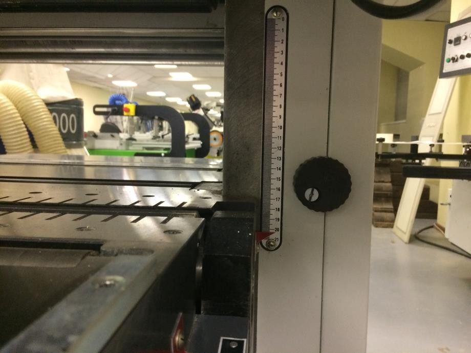 Привод нижнего ножевого вала осуществляется от отдельного двигателя. Настройка глубины съема осуществляется с помощью винта на передней части стола. Отображение размера по миллиметровой шкале.