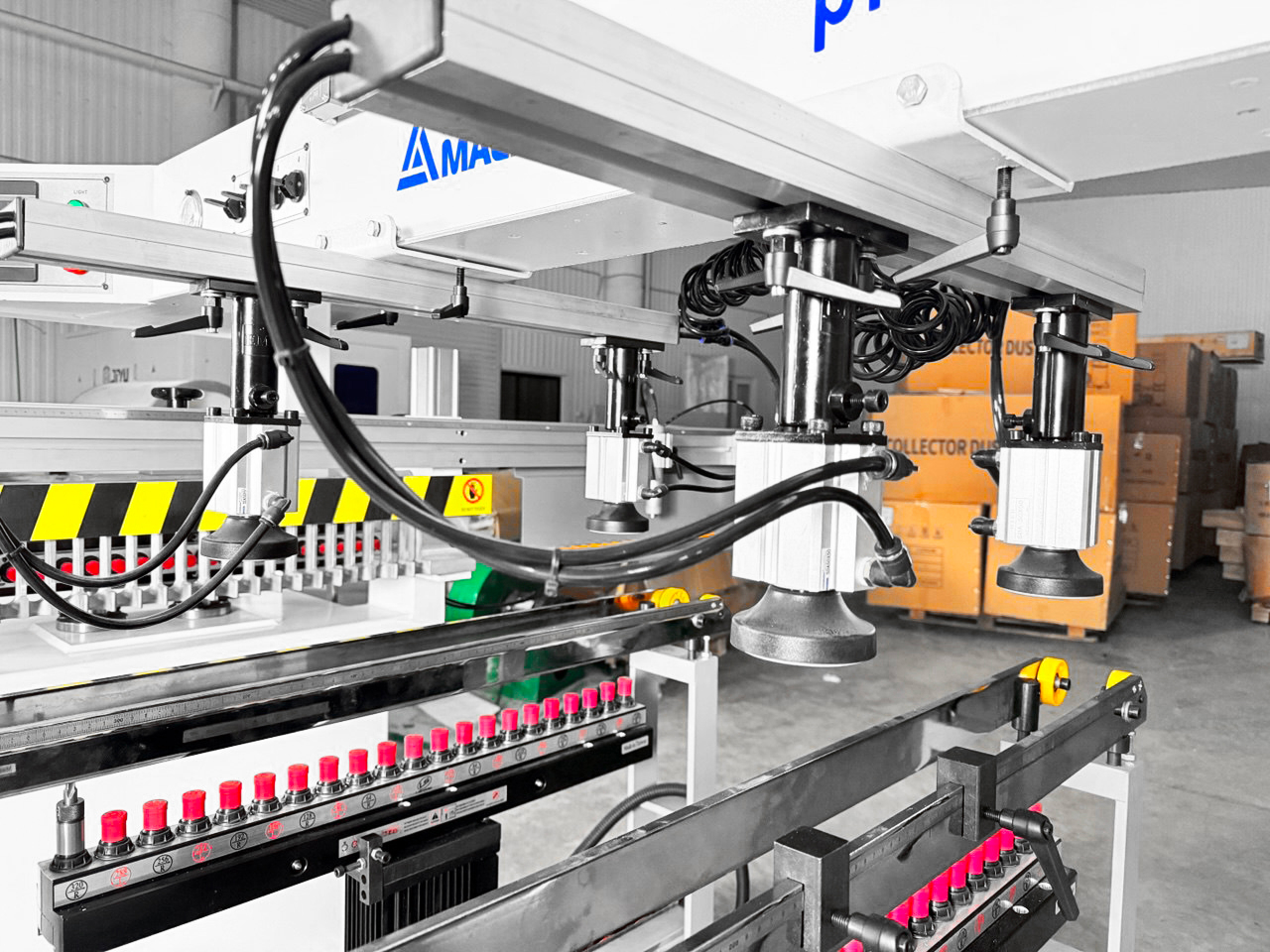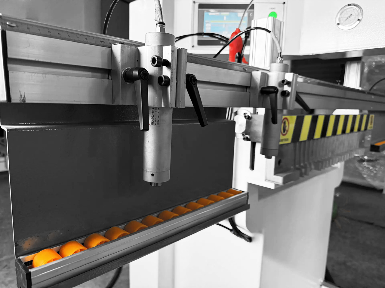 За позиционирование детали по глубине отвечают 4 пневматических упора, выбор необходимых упоров производится с помощью переключателей на центральной панели, что значительно сокращает время позиционирования детали и сокращает время присадки.