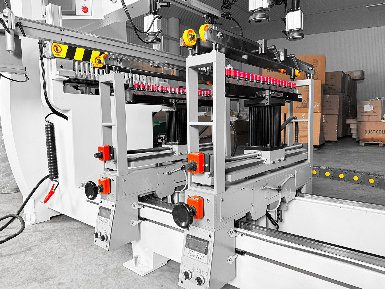 Станок оснащен двумя сверлильными траверсами на каждой из которых 21 шпиндель с шагом 32мм. Одна траверса горизонтальная, для сверления в торец детали и одна траверса вертикальная для сверления в пласть.