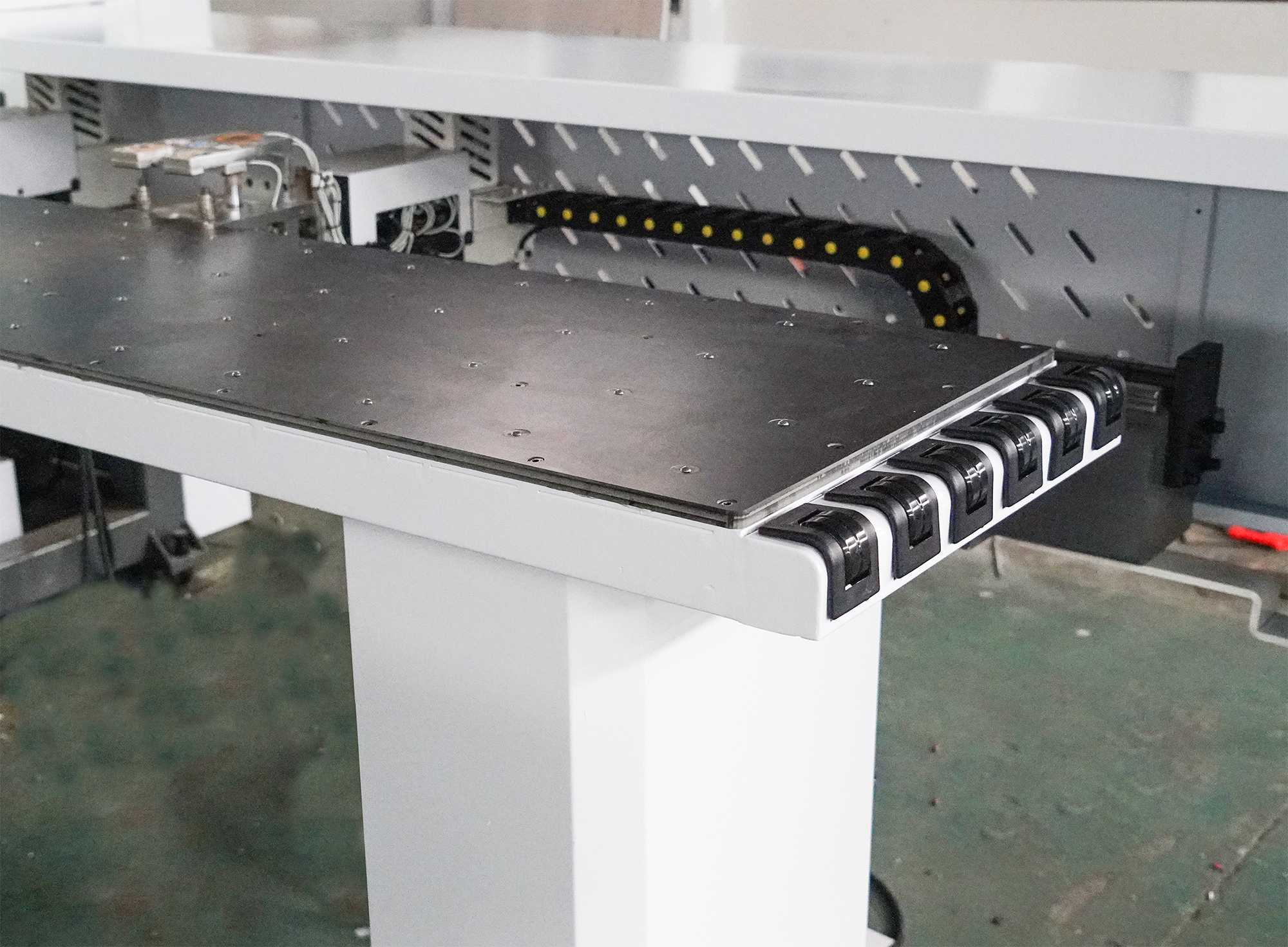 Оборудован системой поддува, это позволяет без особых усилий подавать заготовку в зону обработки и избегать царапин на поверхности материала.