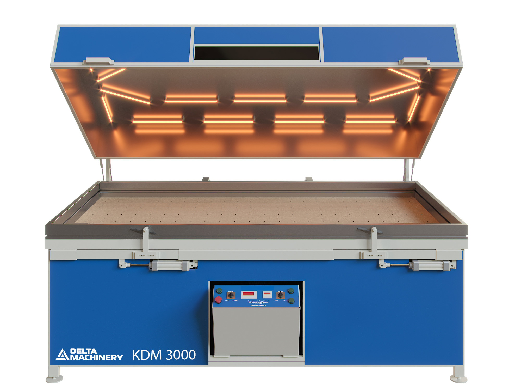 Вакуумный пресс KDM 3000 в модификации с откидным термомодулем отличается от других прессов, производимых нами, тем, что для открытия термомодуля в данной модификации используются газовые упоры. А так же, в данной модификации в базовом исполнении устанавливаются пневматические зажимы прижимной рамки. Они нужны для ускорения работы пресса, т.к. оператору не нужно производить никаких ручных действий с защёлками, они управляются с пульта вакуумного пресса.
