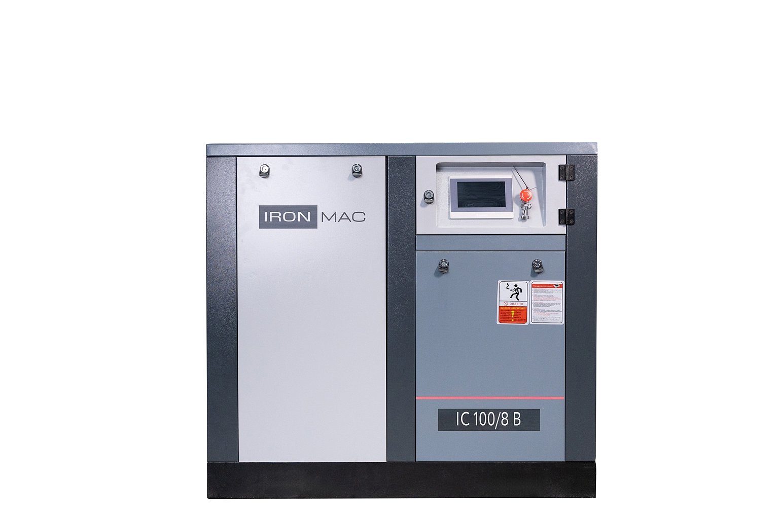 Винтовой компрессор IronMac IC B из основной линейки, собран на прочной стальной раме. Компрессор предназначен для малых и средних предприятий, а все узлы конструкции фиксируются к жесткому основанию и дополнительно изолируются от вибраций. На серии IC B реализована система ременного привода через клиновые ремни, а двигатель имеет уровень защиты от IP 23 до IP 55.